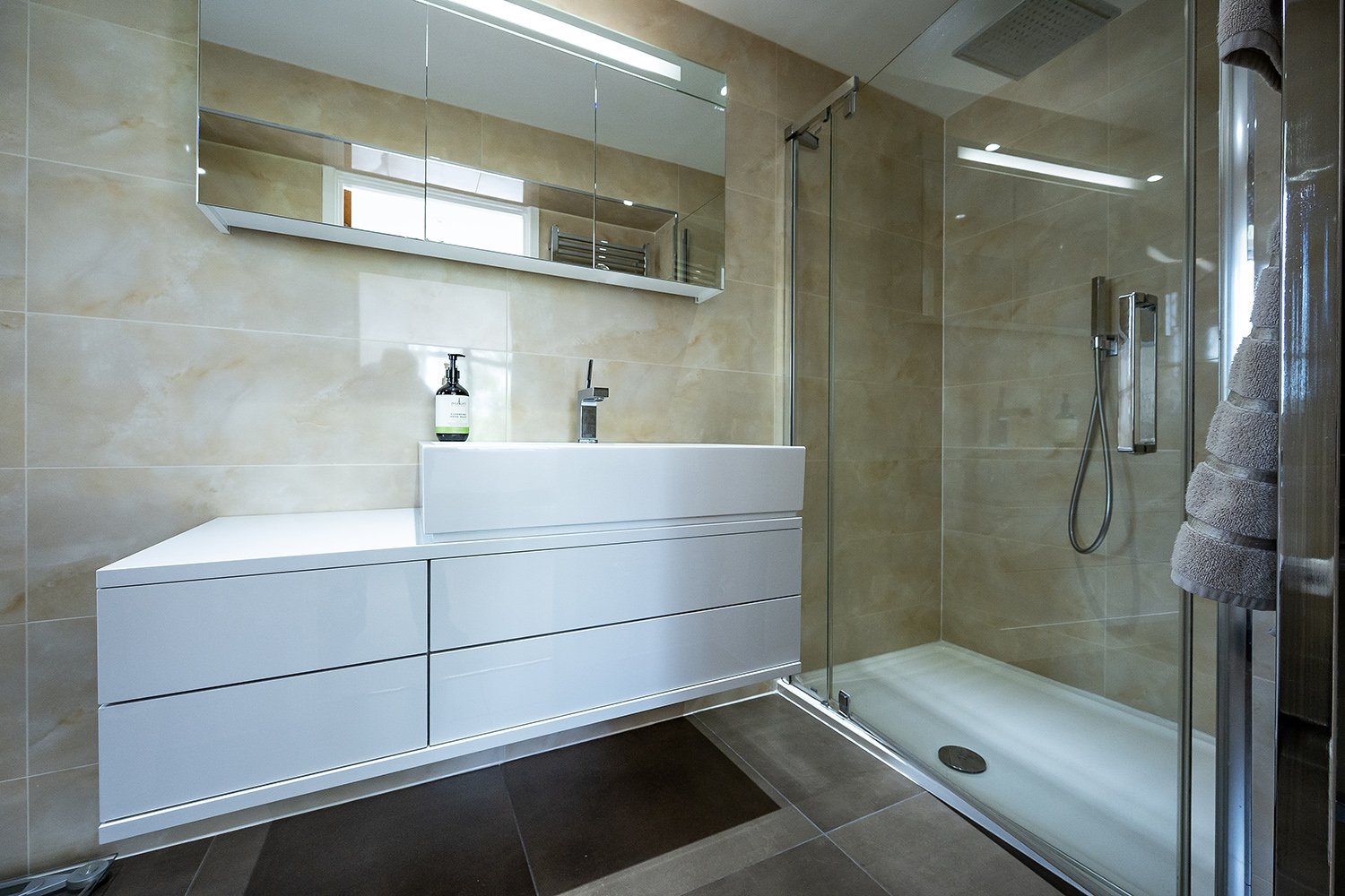 The main bedroom enjoys private access to the rear-facing balcony and a walk-in wardrobe, along with the Ripples fitted en-suite, with double vanity sinks and a large separate shower.